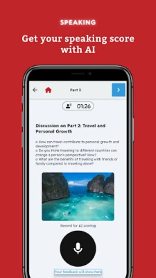 IELTS Speaking with AI Scoring: Refine your pronunciation and fluency. Practice speaking tasks with real-time AI feedback to boost your confidence.