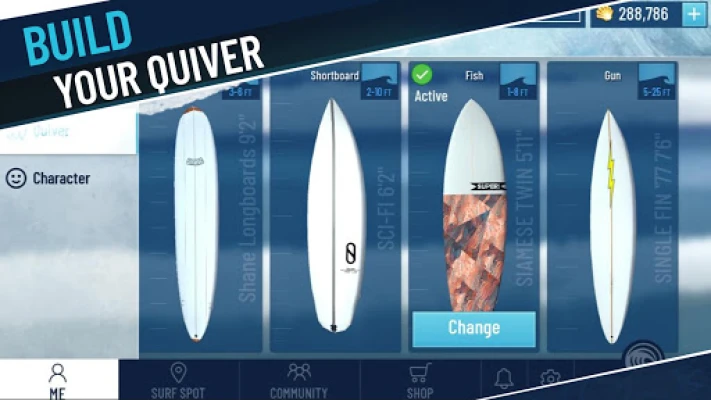 Start building your quiver. You will need shortboards, funboards, longboards, guns and fish according to wave conditions to build up your reputation and become a surfing legend. As you progress through your career, you will unlock new boards to purchase.